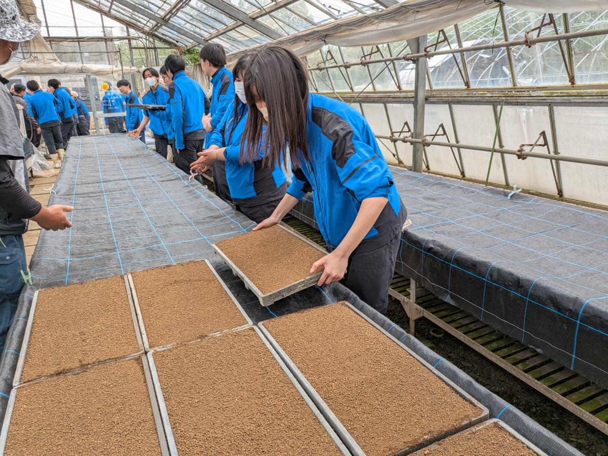 農業科2年1組の生徒たちが近くで見守る中、園児たちは自分の力でていねいに植えていました。