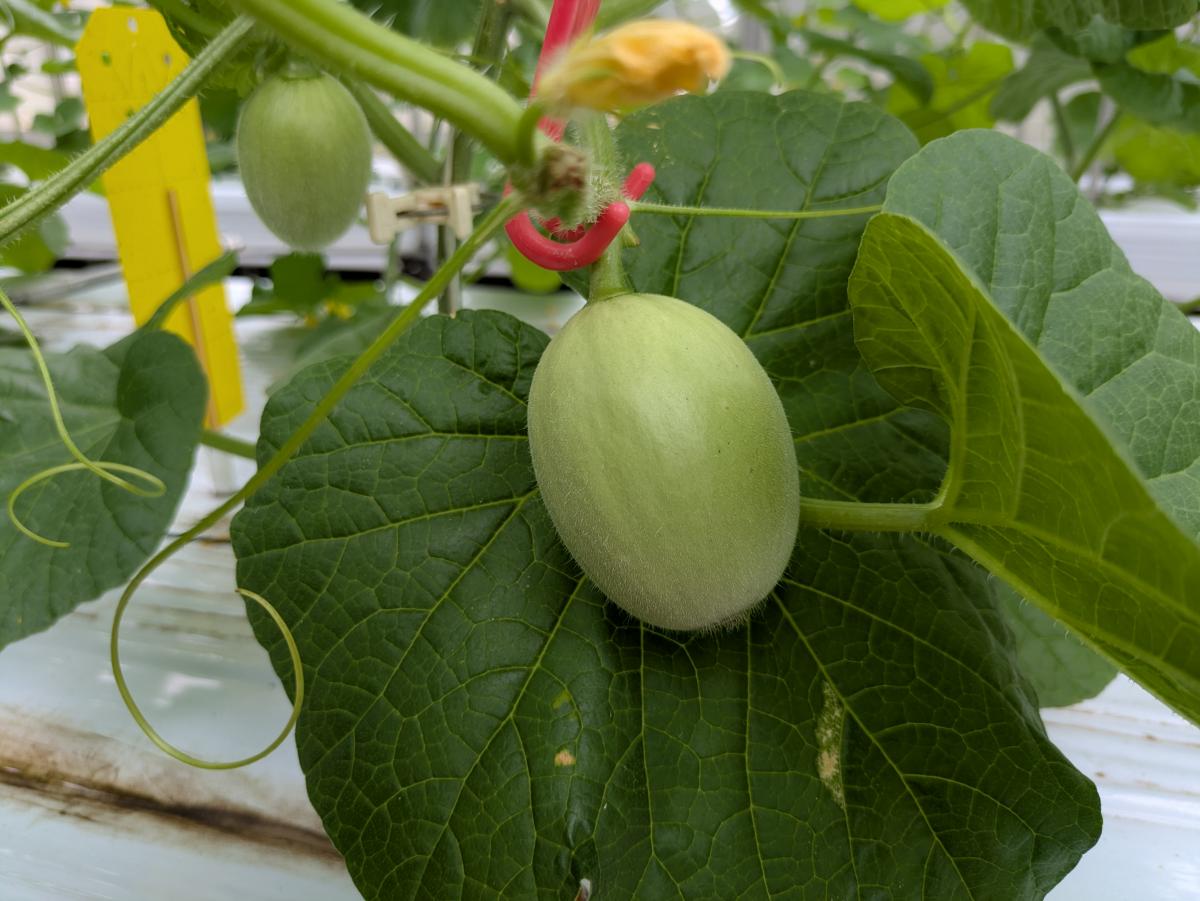 〇10月6日(月)人工授粉が成功しメロンに成長してきました★★★社会人講師の山口正重様から、メロンの人工受粉方法について学びしっかりとしたメロンに成長してきました。引き続き、メロンの人工授粉を山口先生のご指導により実習を継続しています。1つの株で、5つの雌花に人工受粉をしました!