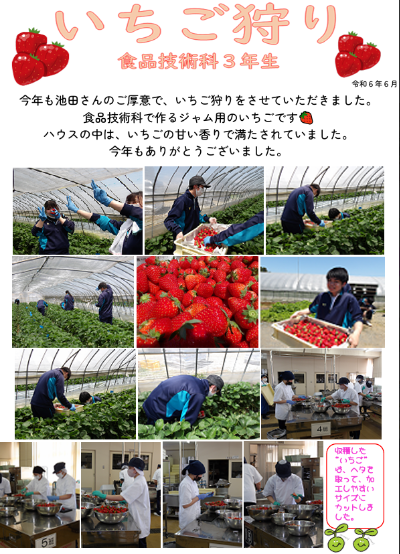 毎年、旧 鉾田農高 卒業生である「池田博則さん」のご厚意により、イチゴを収穫させていただきました。 誠にありがとうございました。感謝の気持ちでいっぱいです。イチゴは、大切に実習などで加工したいと思います。