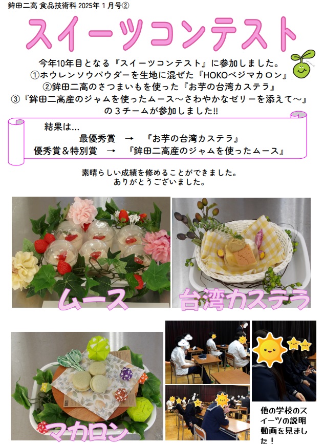 ㊳食品技術科 2025年1月24日(金)3年生 最優秀 2年生 優秀賞&特別賞(ホテルレイクビューにて提供されます。令和6年度第10回茨城県農業関係高校「学校産・地元産食材を使ったスイーツコンテスト」が鉾田第二高校 農場にて開催され、食品技術科3年生チームの「お芋の台湾カステラ」が最優秀。2年生のチームの「鉾田二高産ジャムを使ったムース」が優秀賞&特別賞 ホテルレイクビューにて提供されることとなります(*^▽^*) 受賞するまでには、色々な問題にぶつかりました。しかし、グループのメンバーみんなで意見を出し合い、協力して、工夫を重ね、一生懸命に取り組んできたことが結果につながったのだと思います。ご指導くださった、先生方、夜遅くまでお疲れ様でした。決して、受賞する事だけの結果だけが良いのではなく、諦めずに考え抜くというその過程が・・・最も大切であると思います。県内農業高校の出品した作品はどれも、素晴らしく、きっと審査委員の先生方を悩ませてしまったことだと思います。今回の大会に参加した全ての生徒・先生方の未来が明るく、そして「茨城の農業」発展に繋がっていくことを切に願って(*^▽^*)