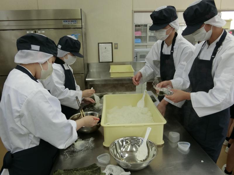 食品技術科の2年生がおにぎり200個と豚汁を作りました。田植えを行う1年生にも食べてもらいました。自分たちで作ったおにぎりと豚汁はおいしかったです。