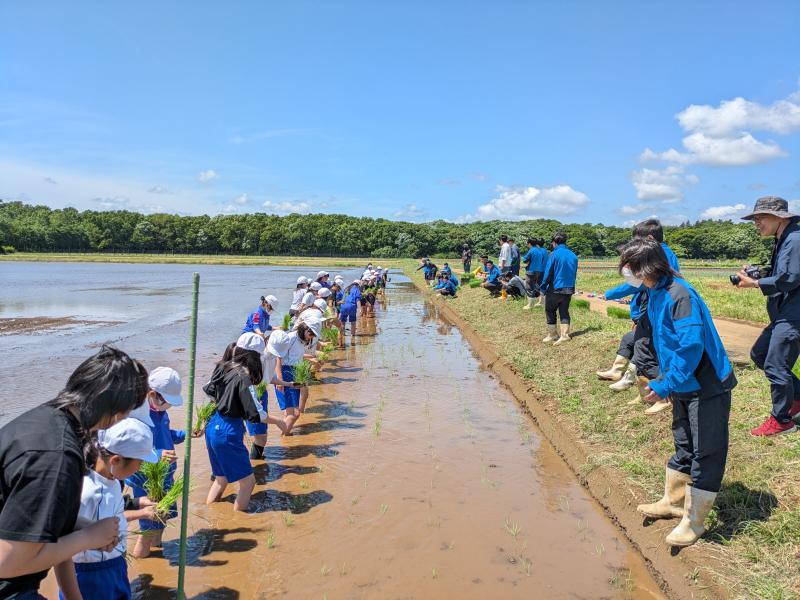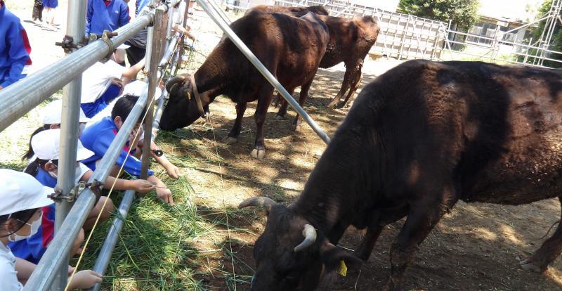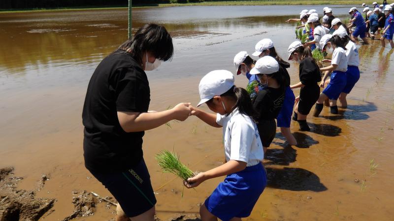 快晴、気温22度でしたが、水田の水はかなり冷たく、児童たちは高校生に手を引かれながら恐るおそる苗の植え付けを始めました。田植えの後は、農場の牛たちへ牧草やり体験も行い、児童たちにとって、充実した実習とすることができました。