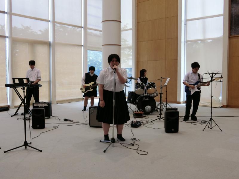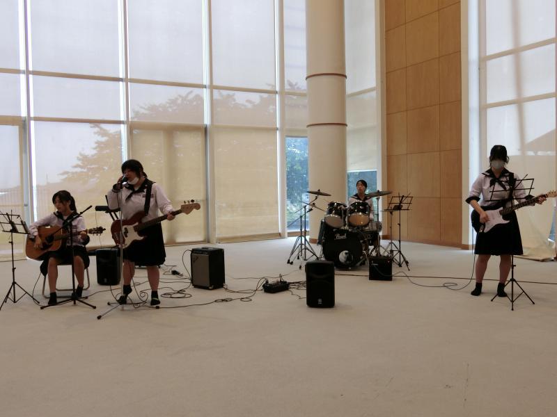 放課後、生徒ホールにて軽音楽部によるミニライブが行われました。多くの生徒が見つめる中、臨場感あふれる演奏を行いました。