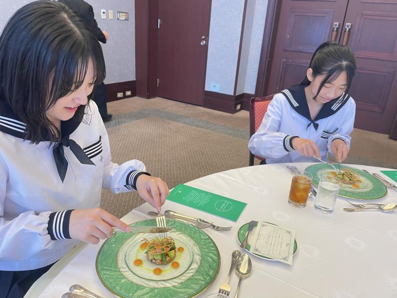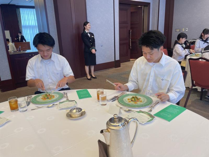 総合学科生活科学系列の3年生8名が水戸市内のホテルでテーブルマナー教室を行いました。ホテルの方からは、お客様においしくお料理を楽しんでいただくためのノウハウを教えていただくことができました。